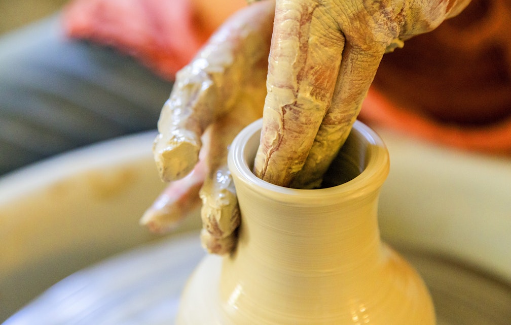 Alles wat vroeger gemaakt werd achter de pottenbakkersschijf, werd gemaakt met de hand en met mens-kracht. Niks stroom! Schoppen tegen het vliegwiel tot de pottenbakkersschijf hard genoeg draaide. Dit betekende een enorme aanslag op de knieschijven van de pottenbakker. Maar hij had geen keus, het was zijn broodwinning en hij ging ermee door tot zijn knieën het begaven. Tegenwoordig gebruikt hij een zacht snorrende elektronisch bediende draaischijf. De techniek van het draaien is evenwel nog steeds hetzelfde als duizenden jaren terug.