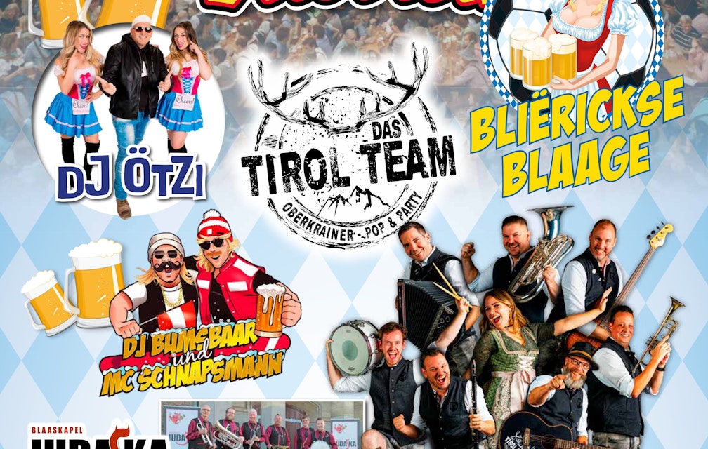 Oktoberfest, vrouwen in dirndl en mannen in lederhose. Bij de prijs zit 1 shotje bij binnenkomst inbegrepen, hapjes, garderobe en toiletten.