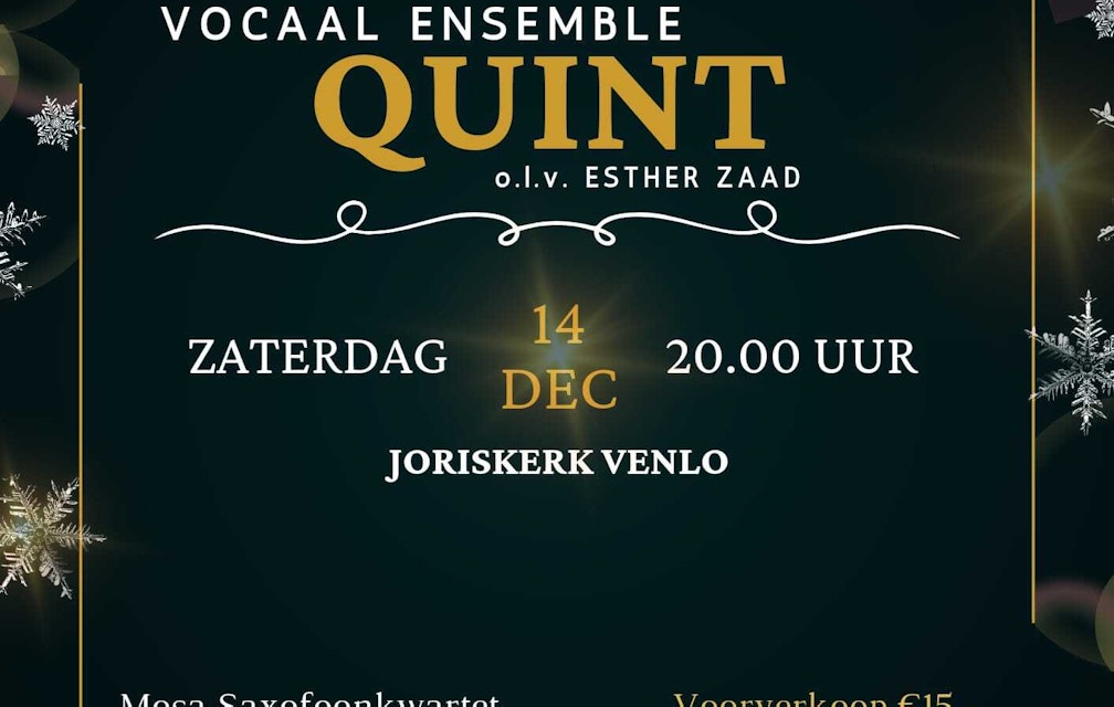Op zaterdag 14 december om 20.00 uur verzorgt het jubilerende Vocaal Ensemble Quint een Winterconcert. Samen met het Mosa Saxofoonkwartet en Woordenschilder Loek Peeters zal een gevarieerde en sfeervolle avond worden neergezet. Op piano wordt Quint begeleid door Arno Kerkhof.