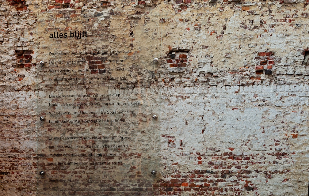 Deze muur staat op een van de oudste delen van Venlo, vlakbij de Martinuskerk, huize Schreurs en het “ald Weishoës”, wat vroeger de stadsschool was. In de Middeleeuwen werden hier bierbrouwerijen gebouwd en zo ontstond de Brouwersplaats. Heel bekend was Brouwerij Wolters die menig café bediende met geestelijk vocht. Tijdens de Tweede Wereldoorlog werden de brouwerijen verwoest. Deze muur is blijven staan en vormt nu met het gedicht “Alles blijft” een prachtige eenheid.