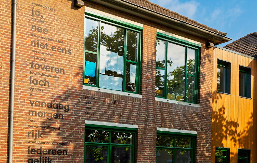 Uiteindelijk is gekozen voor opvallende zinnen uit meerdere bijdragen. Het resultaat is het gedicht dat nu op de gevel prijkt. Daarbij is gebruik gemaakt van tekstflarden van Philine, Jada, Roos en Esmee. Het gedicht is eind 2019 geplaatst.