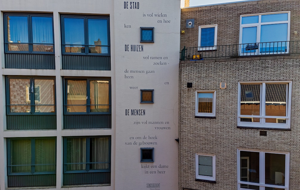 Stadsgezicht, een gedicht van Pierre Kemp is speels afgebeeld over de hele lengte van een gevel en sfeervol om drie ramen heen gedrapeerd. Dit gedicht is geplaatst in 2017.